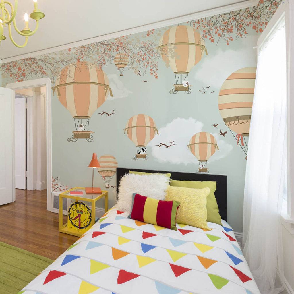 Эти фотообои могут быть повторно использованы и перемещены, так как они изготовлены из нетоксичных, водных и экологически чистых чернил. Это очень прочный материал. Этот великолепный дизайн имеет пастельные воздушные шары с собакой внутри каждого из них, плавающих в облаках рядом с деревьями и птицами. Данные фотообои будут идеальным акцентом стены в спальне любого ребенка.