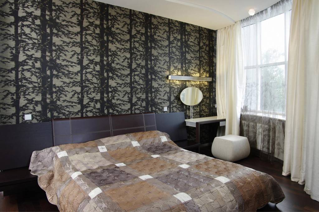 - не яркая и симметричная поверхность станет прекрасным дополнением обоев с узором. Интерьер спальни обои двух видов фото;