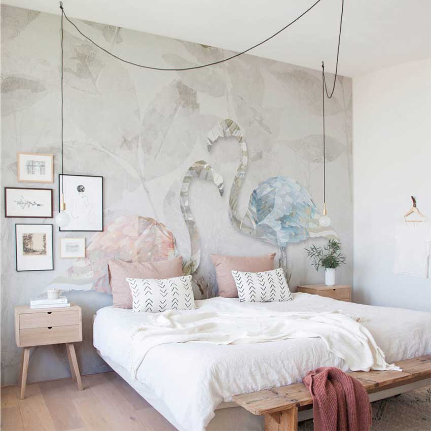 Цветы и растения в светлой палитре могут занимать внушительную часть стен, при этом не скрадывая пространство маленькой спальни.