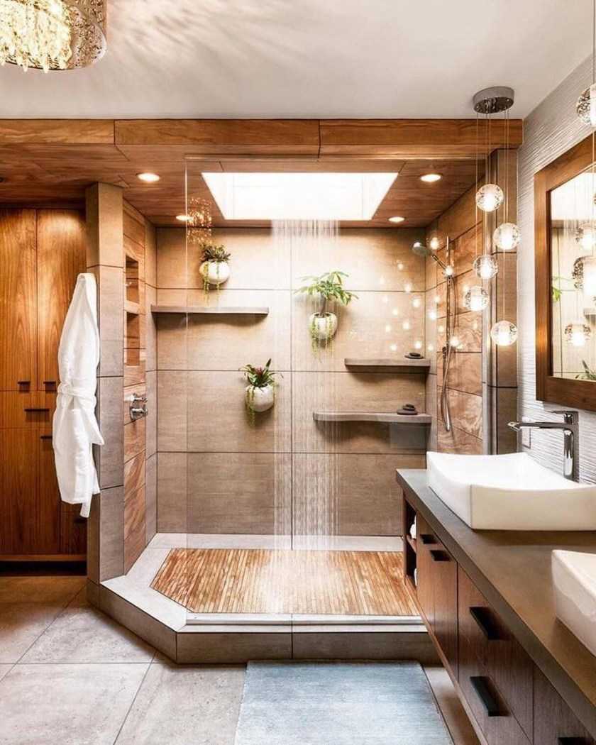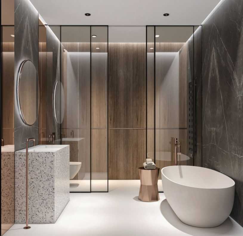 Современные интерьеры сочетают классические черты с прагматичностью и функциональностью. Они эклектичны и разнообразны, поэтому можешь комбинировать натуральный камень с акрилом и хромом, а состаренное дерево – с ультрасовременными душевыми кабинами. Чтобы не перегружать пространство, уравновесь игру фактур простотой форм и планировки.