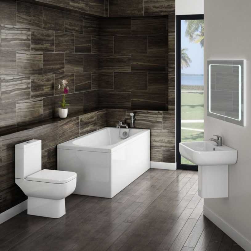- Темный цвет в мокрой зоне. Если вы устанавливаете ванную на дальней короткой стене, сделайте отделку материалом на несколько тонов темнее, чем основной. Стена будет смотреться ближе.