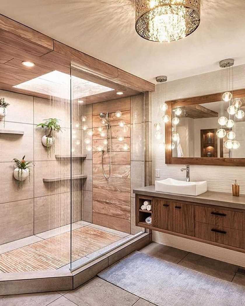 Чтобы вписать душевую кабину в классическую ванную комнату, используй элементы более современной неоклассики или дизайнерскую состаренную сантехнику. Основные цвета – бежевые, коричневые, пастельные и сложные темные оттенки. В качестве украшений – лепнина, потолочные розетки, светильники с хрустальными подвесками, тяжелые рамы для зеркал.