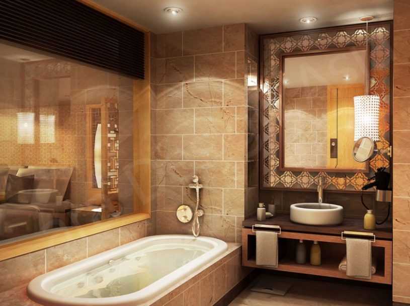 Отделка стен в ванной комнате выполнена из керамогранитного камня
