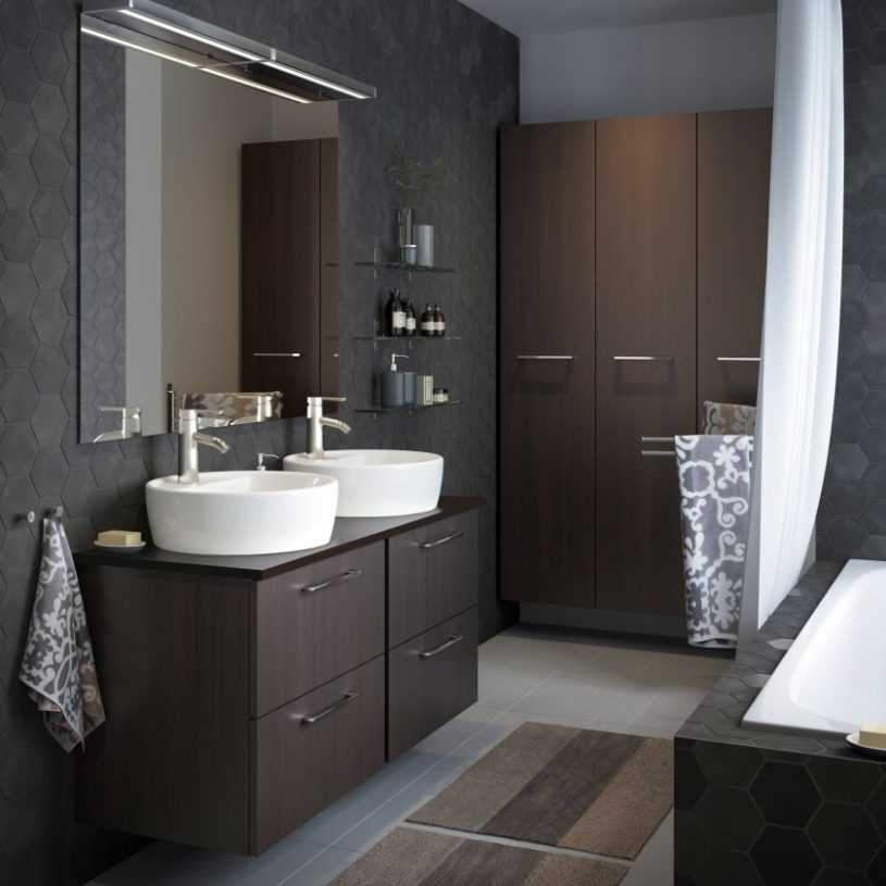 - Большая прямоугольная. В просторном санузле хватит места на напольные шкафы и вместительные пеналы. Не устанавливайте мебель в 2 ряда на длинных сторонах, оставляя узкий проход. Наиболее выгодный вариант планировки — угловой.