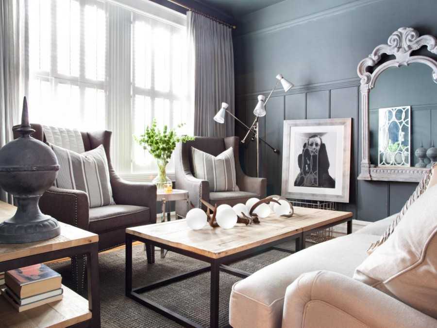 При выборе стиля часто отталкиваются от места проживания: частный дом обладает большим количеством окон, которые впускают много света. Просторное светлое помещение позволяет применять цветовые решения, которые не «сработают» в небольших комнатках. Ниже представлена гостиная с темной мебелю и серым ковровым покрытием. Такая комбинация смотрится современно и необычно, но подойдет только для комнаты с высокими потолками и хорошим освещением.