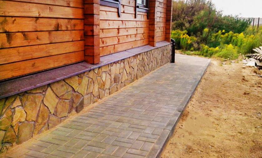 - С различными видами отделки. Поверх отмостки можно уложить различные отделочные материалы, что сделает внешний вид строения более привлекательным. Для этой цели используют плитку, брусчатку, керамогранит или природные материалы.