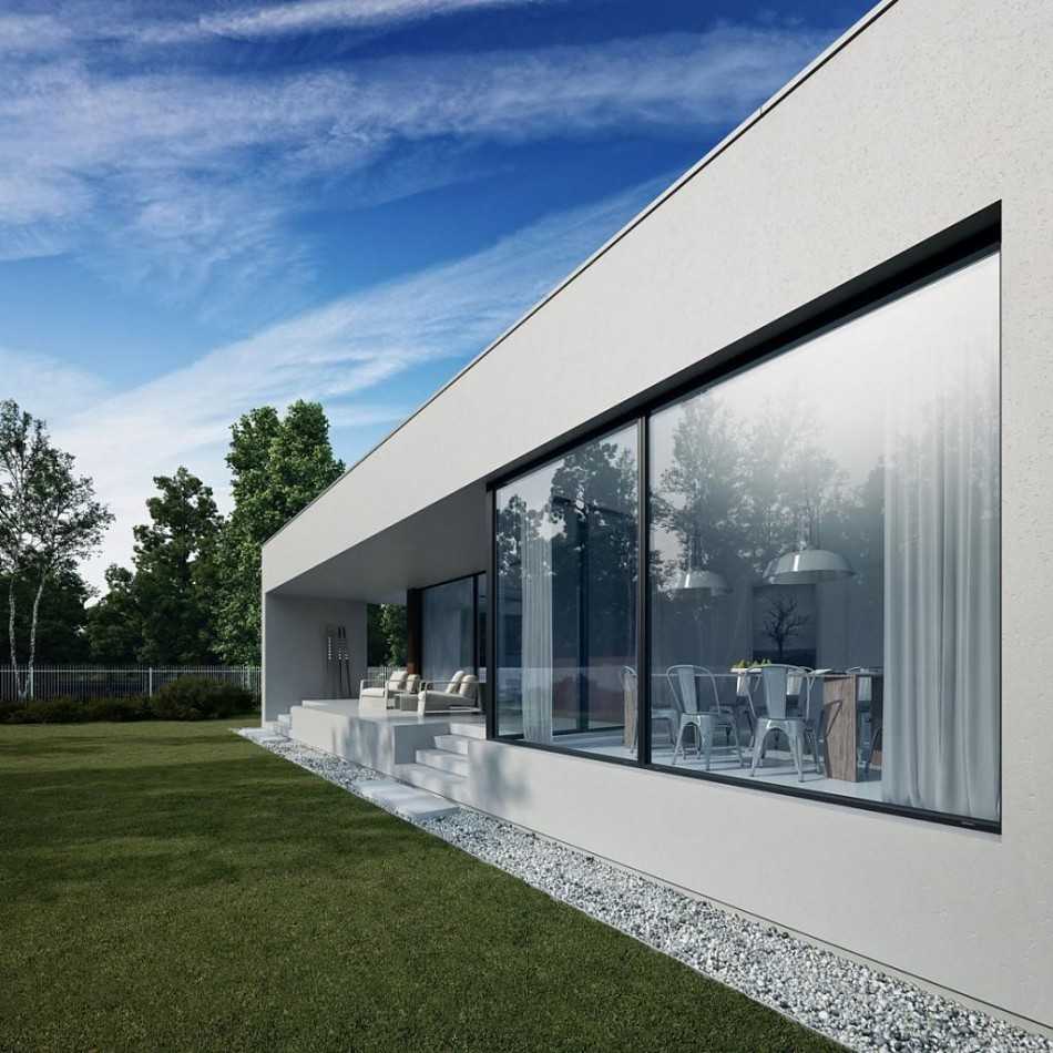 Разумеется, фасад приобретает большую легкость, если элементы остекления, образующие такое окно, будут склеены в углу. Благодаря своим конструктивным возможностям, они принимают форму балконных дверей, панорамных окон и интересного полосового остекления. Такие формы делают их зачастую самым привлекательным элементом архитектуры дома.
