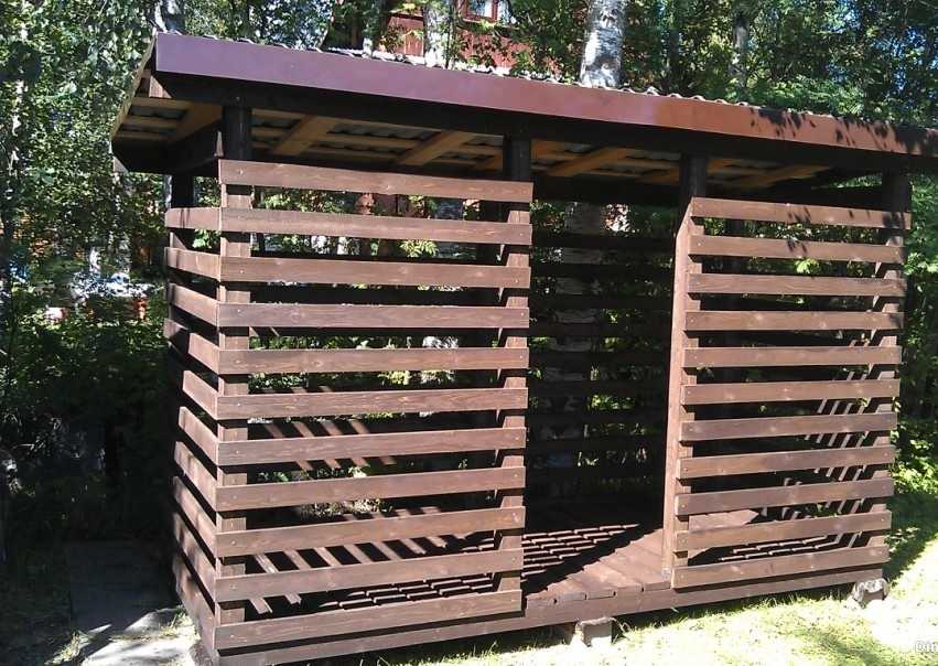 - Материал укрытия — дерево, оно хорошо вписывается в ландшафт и стоит недорого, в отличие от металла. Изготовление стен из листовой стали приведёт к избыточному нагреву на солнце и пересушиванию дров.