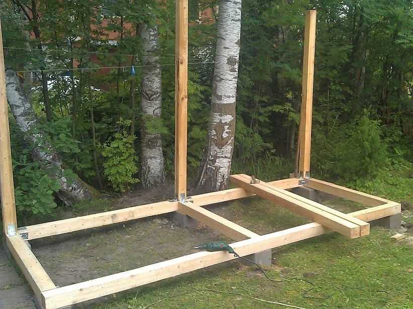 Сначала выложили брусья нижней обвязки, скрепили их гвоздями (80*3 мм). Затем на шурупы закрутили в уголки. Следующий шаг — установка стоек. Их ставят по углам и над промежуточной опорой. Задние стойки короче передних — чтобы был уклон кровли. Их тоже сначала выставили вертикально (проверяли отвесом), забили наискось гвоздями — по два с каждой стороны. После укрепили уголками на шурупах — по два на стойку. Если есть опасения, можно еще пластины прикрутить/прибить к каждой стойке снаружи.