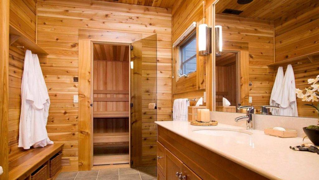 Для таких помещений подходит вариант из массива, а также комбинации материалов. Удачное решение — распашные модели деревянные со стеклом от Sawo. Они предоставлены коробкой и основой из кедра или осины. Саво из бронзы удачно дополняет интерьер.