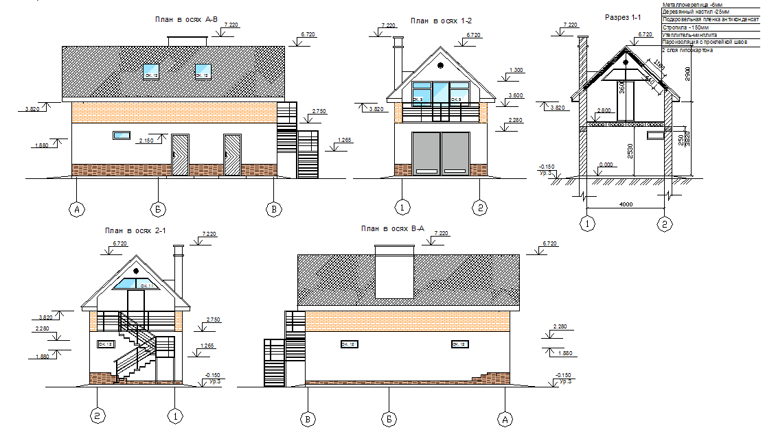 - боковые разрезы показывают высоту фундамента, опор, уровень расположения горизонтальных и диагональных связей, отметку конька и свесов кровли.