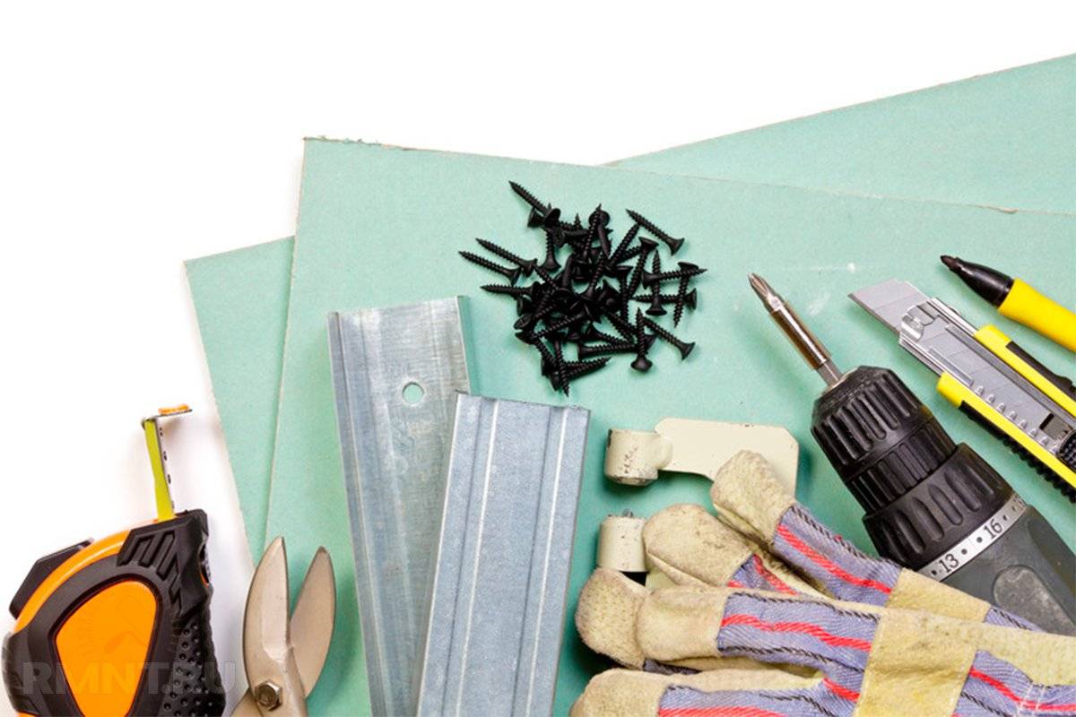 Условно монтажные работы делят на три этапа (монтаж каркаса, разводка электрики, обшивка гипсокартоном). Но сначала стоит определить для себя список необходимого инструментария и запастись им перед началом работ.