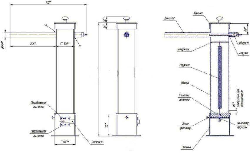 Понять особенности установки эжектора помогут готовые чертежи дымогенераторов. Их без труда можно найти в интернете. Это устройство связано с компрессором, который нагнетает внутри него давление. Двигающийся воздух создает зону разряжения в этом элементе. В результате дым из эжектора проходит в дымоходную трубку.