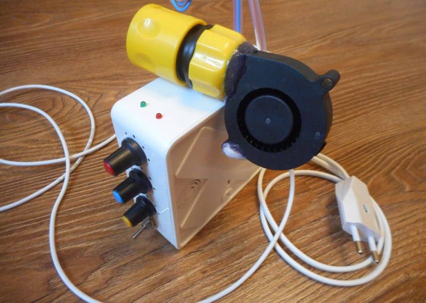 В первую очередь потребуется взять пластиковую бутылку и обрезать ее верхнюю часть. Далее с помощью клея следует присоединить вентилятор к внутренней части обрезанного пластикового элемента. С другой стороны (к горлышку) подключается шланг. Второй выход трубки подсоединяется к дымогенератору. Такая конструкция отлично справляется со своей функцией. Единственный ее минус заключается в непрезентабельном внешнем виде.