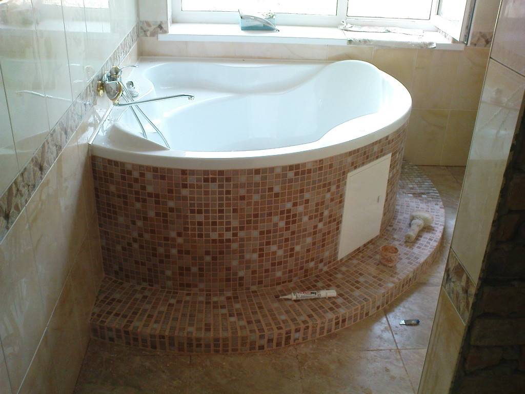 Полученный каркас облицовывают керамической плиткой, закрепляя ее с помощью плиточного клея. Швы уложенной плитки необходимо обработать специальной затирочной смесью, защищающей от образования грибка и плесени.
