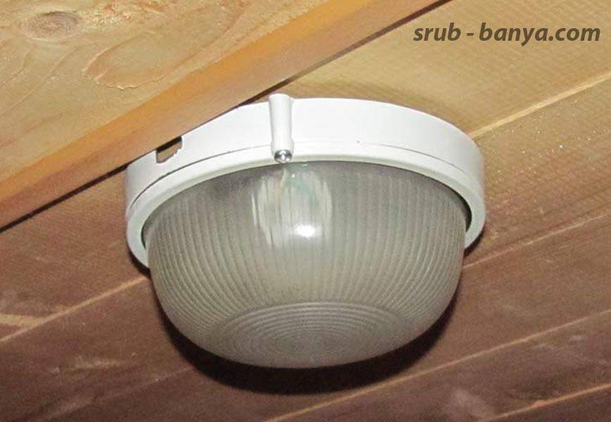 Светильник в парилке. 7. Светильники, применяемые в бане должны быть герметичными, надёжно защищёнными от влаги и высокой температуры. Класс защиты не ниже IP-44. Корпус – металлический, плафон – стеклянный. Плафон, желательно, должен быть защищён сеткой (для предотвращения разлёта осколков). Светильник в парилке должен размещаться так, чтобы предотвратить возможность соприкосновения с веником парильщика, который находится к светильнику ближе всех. |