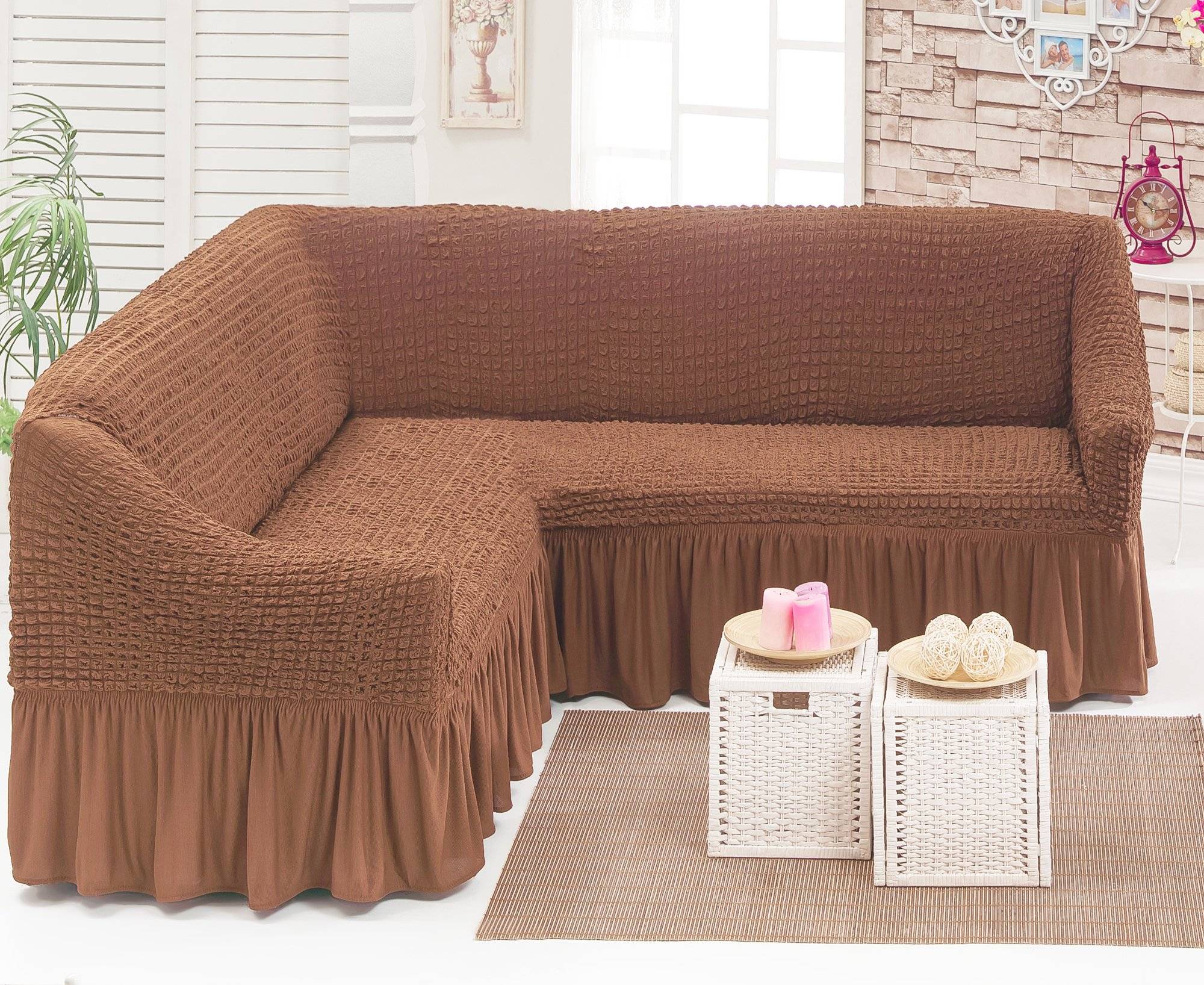 - для угловых диванов. Накидки делятся на левосторонние и правосторонние, в зависимости от направления стороны угла. Их длина выбирается согласно количеству посадочных мест. Как правило, они достигают 5 метров в длину. При их покупке измеряется не только ширина и высота спинки, но и выступы;