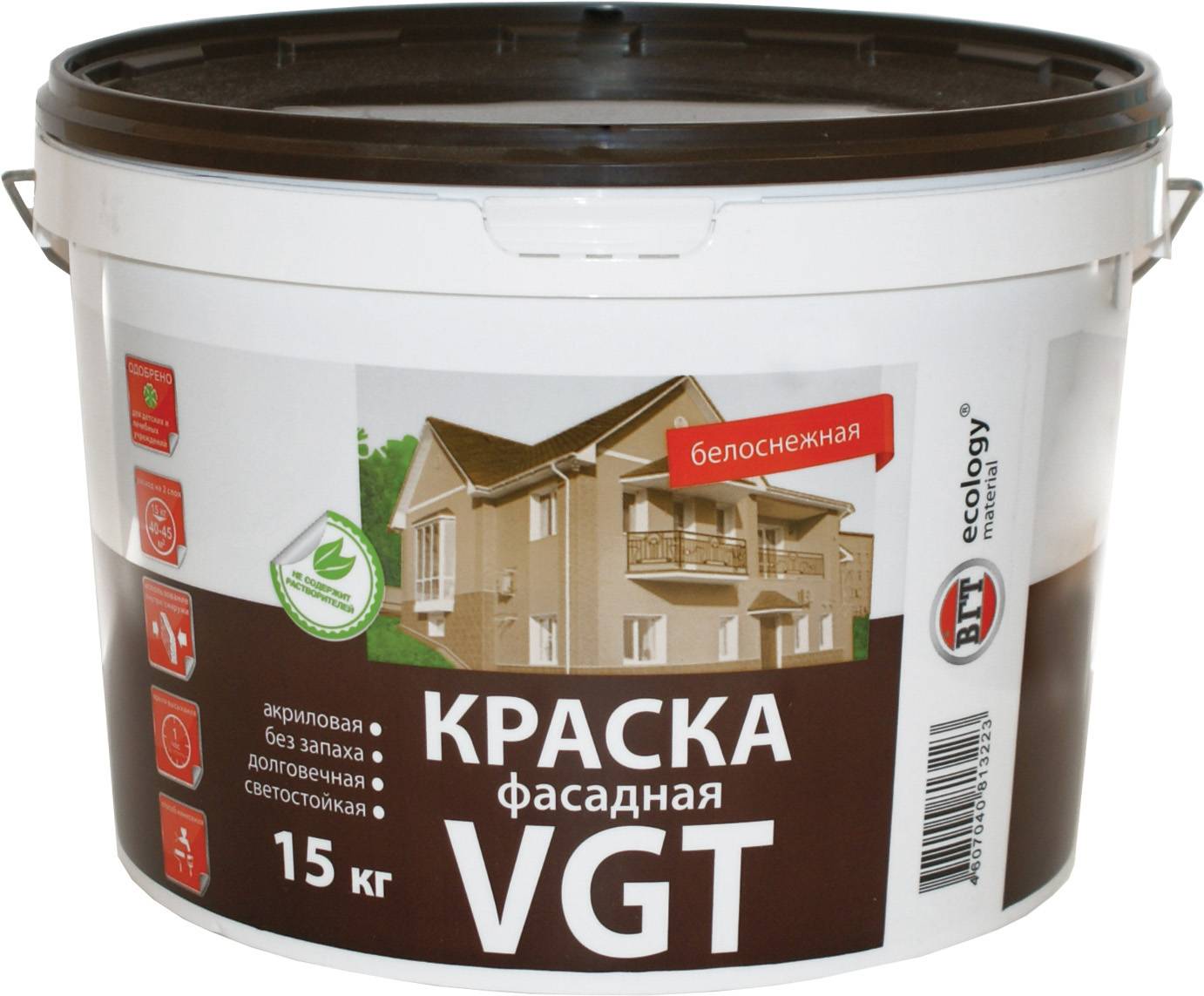 Краска ВД АК 1180 фасадная ВГТ — водо-дисперсионная, выпускается цвета «Белоснежная» или «Супербелая», со временем она не желтеет, можно колеровать красителями фирмы ВГТ. Применяют ее для фасадов и влажных помещений, краска ВД АК 1180 имеет высокую адгезию к различным поверхностям. Расход составляет около 160-180 г/кв.м. в один слой.