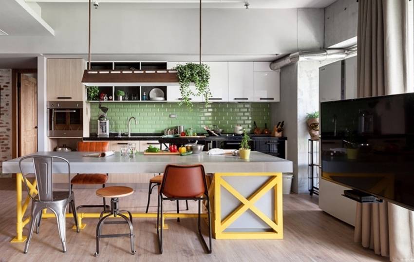 Уже долгое время в стиле лофт наблюдается устойчивая мода на фартук из грубо обработанной, шероховатой плитки с эффектом состаренной отделки. Укладка — только «вразбежку». При желании используется имитация под красный или белый кирпич. Клинкер и медь — варианты, которые неплохо имитируют стиль лофт.