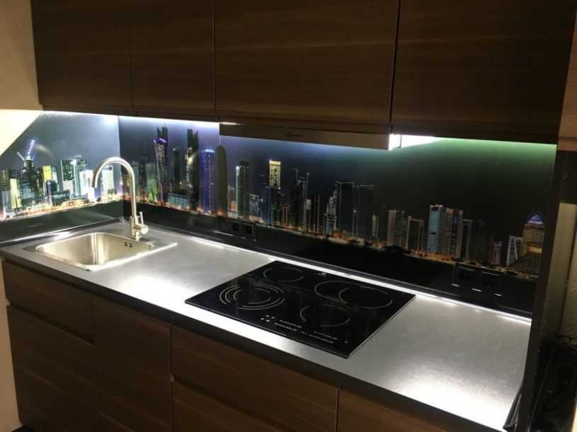 - Фартук из стекла отличное решение, если снабдить его дополнительной подсветкой.