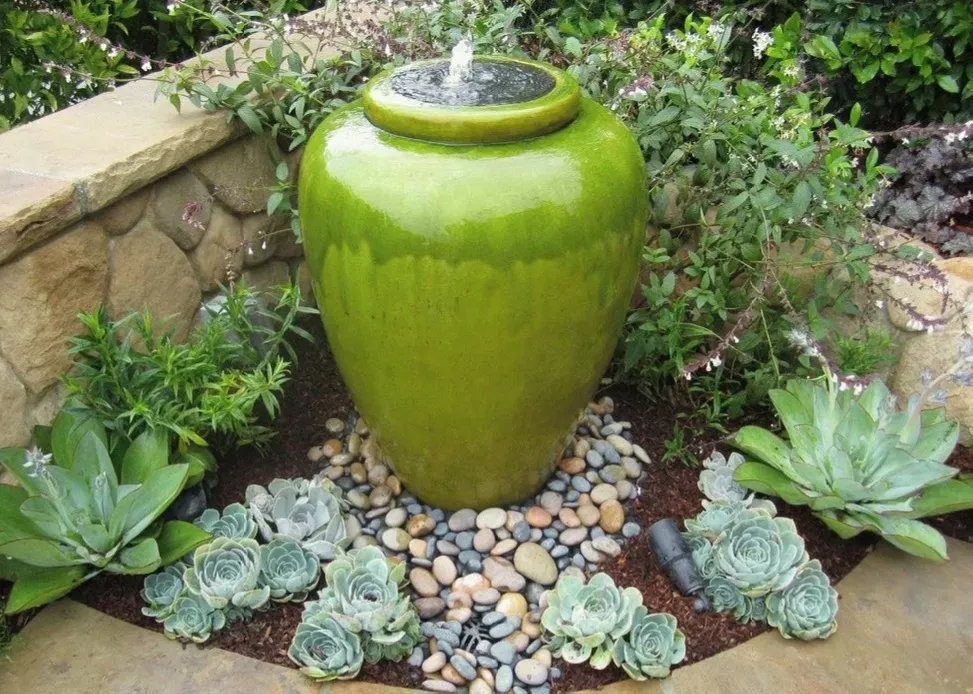 Глиняные горшки есть почти в каждом приусадебном хозяйстве. Несколько кувшинов различного размера создадут оригинальную композицию и освежат воздух в жаркие летние дни. Фонтаны для сада из таких материалов не требуют больших затрат.