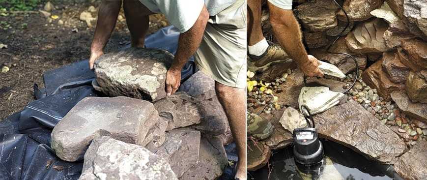 На выложенную пленку выкладываются валуны. Если котлован ступенчатый, валуны должны лежать на каждой ступени. Когда оформление чаши практически завершено, ставится насос. Чаша заполняется водой и проводится тестирование — и чаши на герметичность и работоспособности насоса.