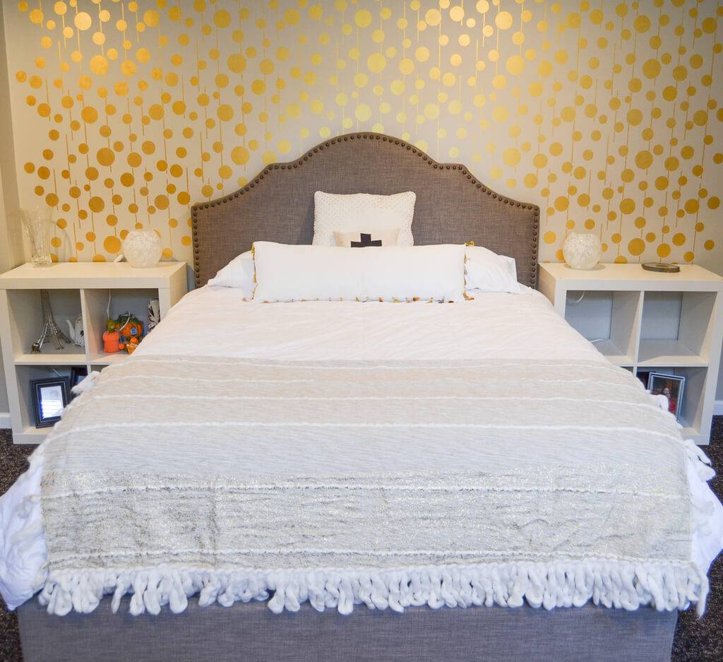 Создайте красивую, стильную стену с золотыми фотообоями. Эта тенденция была популярным выбором дизайна интерьера, который действительно создает яркий акцент. Включение золота в спальню раньше считалось высококлассной функцией и привилегией, но теперь золотая детализация в комнате придает ей более изысканный вид, не будучи слишком “царственной».” Если вы украшаете спальню вашей дочери или даже свою собственную, придайте пространству ультра-гламурный вид, выбрав золото. В этом пространстве так много мерцания и блеска, что делает спальню элегантной и величественной.
