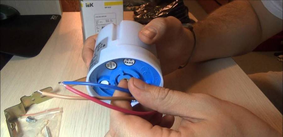 - вывод в изоляции синего или серого цвета – «ноль», к которому подключается второй питающий проводник и один из проводов от нагрузки;