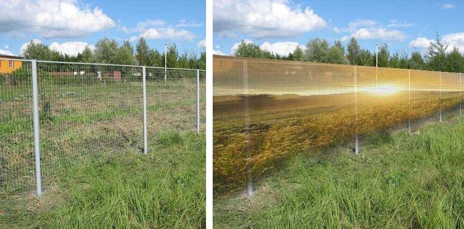 Второй плюс фотосетки для забора — она пропускает свет. И если ваша ограда стоит на меже с соседом, у него не будет причин жаловаться на то, что ваш забор затеняет его посадки: света пропускает достаточно. Вместе с тем очень мелкая ячейка значительно снижает просматриваемость вашего участка: просто сетка без рисунка просматривается на 35%, а при нанесенном рисунке не видно почти ничего. Даже силуэты различаются с трудом.