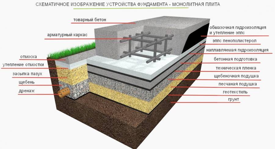 - монолитный — универсален, является самым надежным, но, в то же время, и самым затратным по стоимости. Цельная плита из бетона равномерно распределяет нагрузки от бани, грунт не проседает, а постройка не деформируется и не трескается.