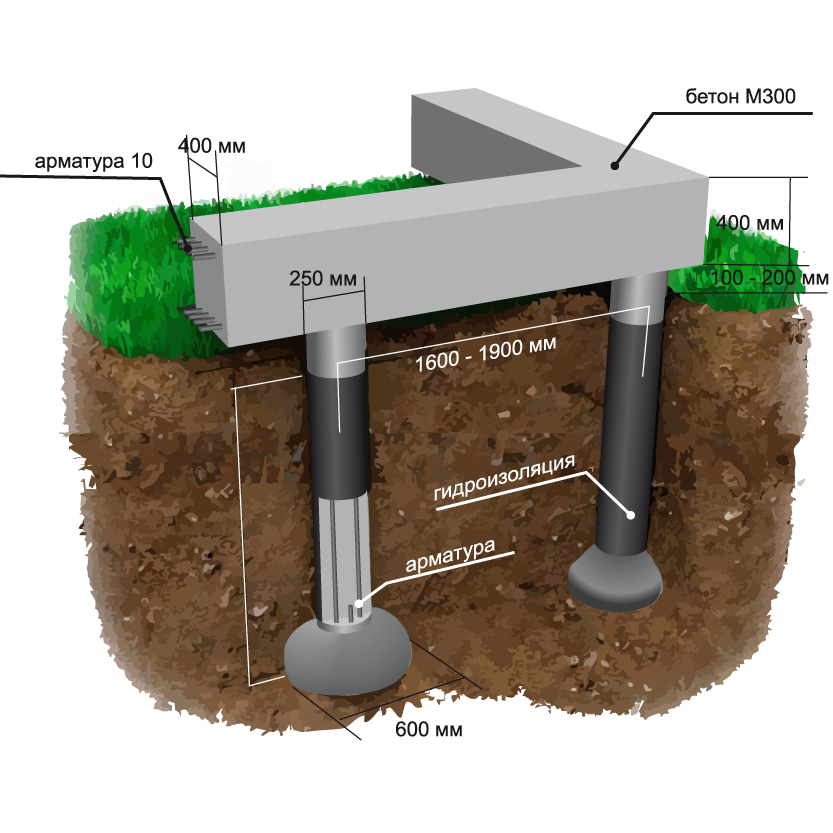 Лента-ростверк выполняет горизонтальную перевязку столбов и равномерно распределяет нагрузки между сваями. Отсутствие контакта с грунтом нивелирует действие сил пучения на ростверк фундамента.
