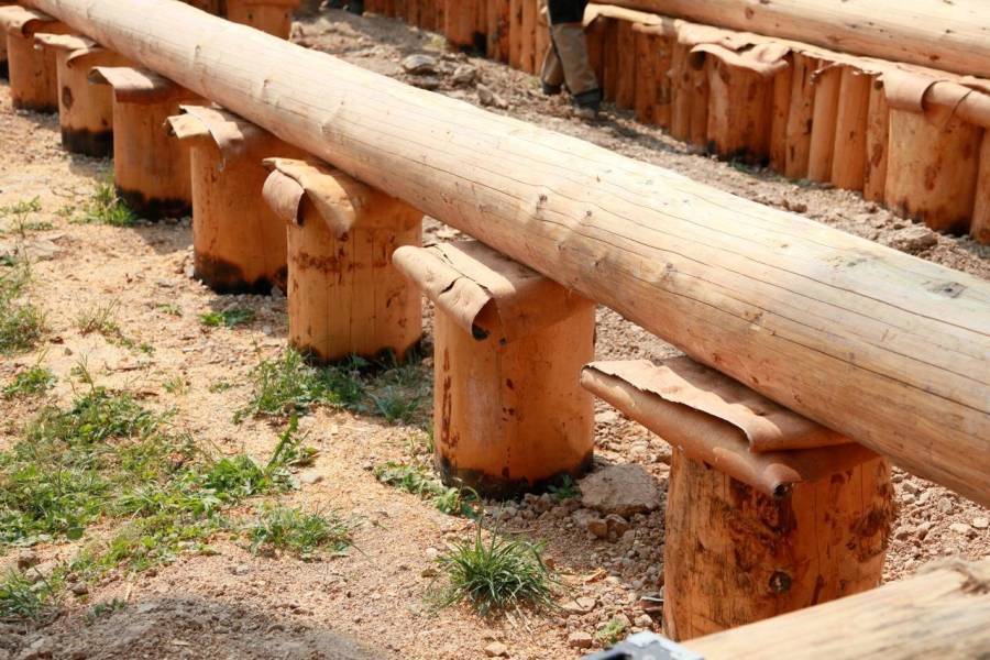 В качестве основания постройки обустраивается фундамент ленточного или столбчатого типа. Важным требованием при сооружении японской бани своими руками является выполнение строго горизонтального положения здания. Для выполнения этого условия при ландшафте, имеющем неровный рельеф, сооружают строение на сваях.