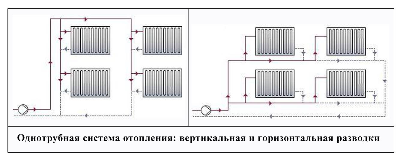 Рассматриваемый монтаж системы отопления частного дома предусматривает прохождение горячей воды через все радиаторы. При этом система может быть выполнена как с вертикальной разводкой, так и с горизонтальной, схема подключения отопления частного дома с обоими типами разводки приведена ниже: