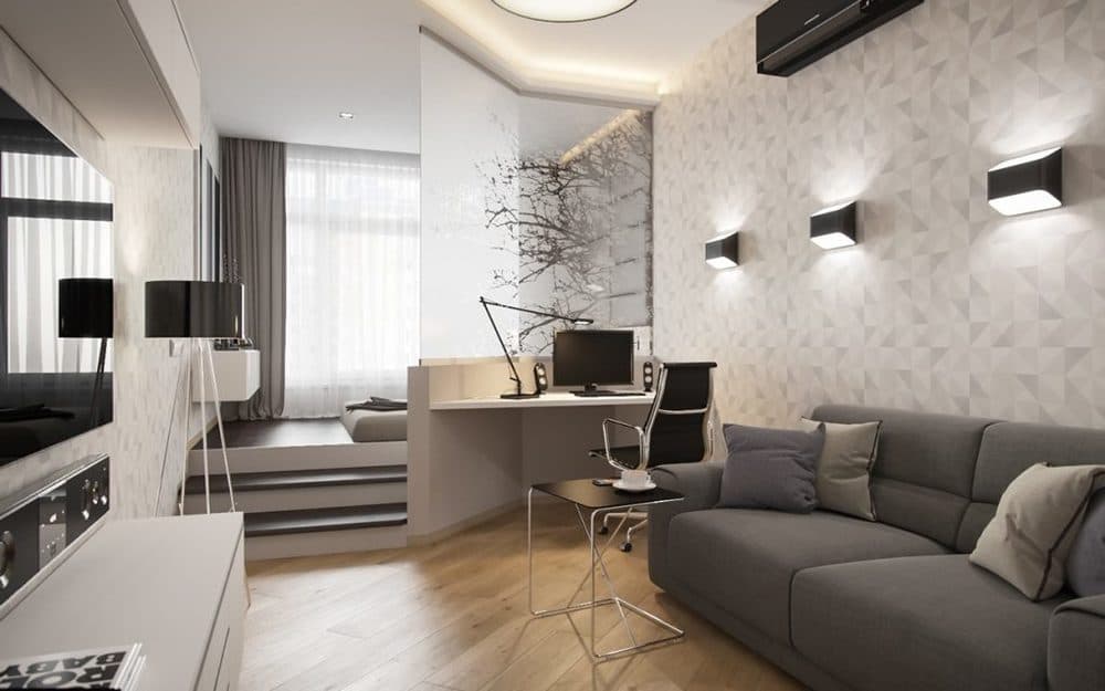 В целом в небольшом размере обстановка в стиле минимализм смотрится лучше. Стеллажи и шкафы не должны быть громоздкими. Замечательно, если на втором будут зеркала — они зрительно расширят пространство. Разделить площадь на функциональные зоны можно с помощью разного дизайна: