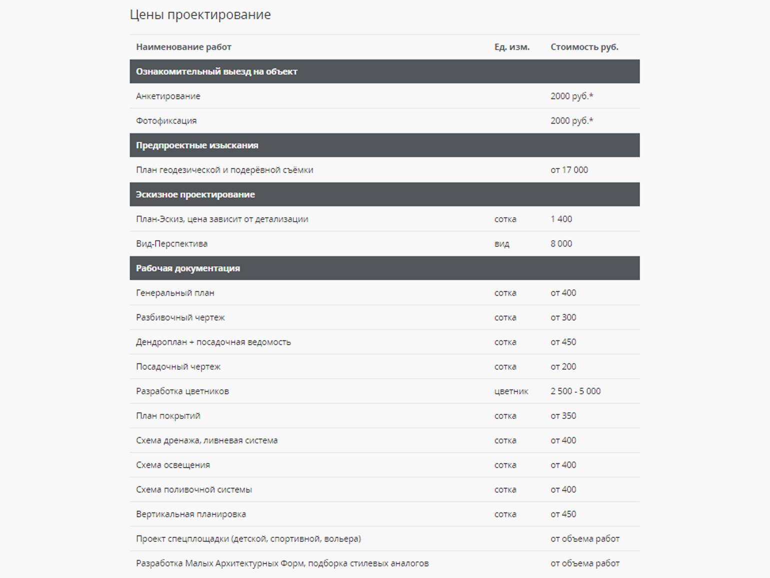 Пример цен на проектирование от компании по ландшафтному дизайну и благоустройству AG garden design. Скриншот: сайт ag-gardendesign.ru