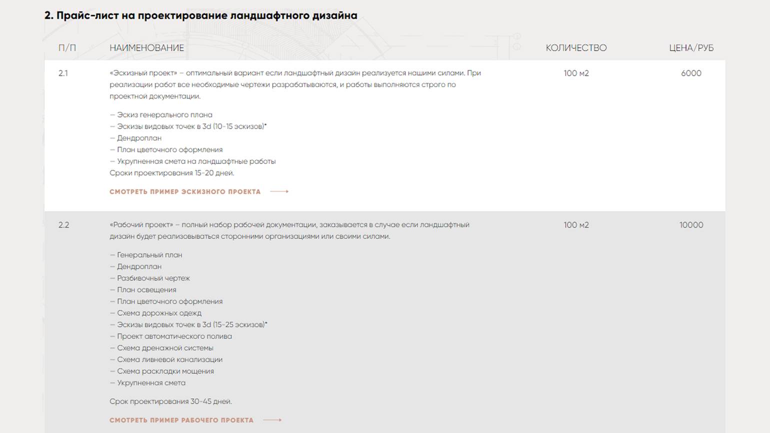 Пример цен на проектирование от компании по ландшафтному дизайну Lenotr Park. Скриншот: сайт le-park.com