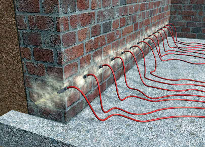 Инъекционный материал по консистенции напоминает гель. Не всегда есть необходимость сверлить отверстие для его введения на всю толщину стены. Часто достаточно добраться до середины сверлом небольшого диаметра. Дополнительно понадобится аппарат, который сможет создать достаточное давление для правильного распределения гидроизоляции внутри стены