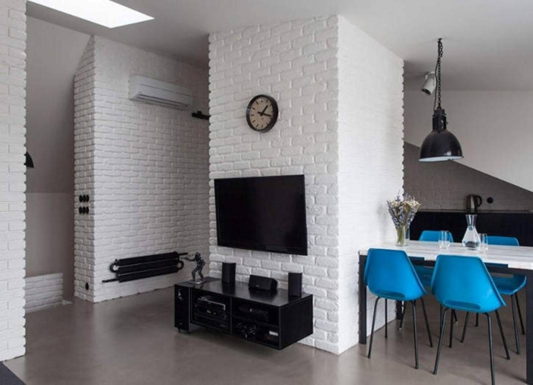 На фото интерьер кухни-гостиной, декорированный гипсовой плиточной отделкой с имитацией кирпича.