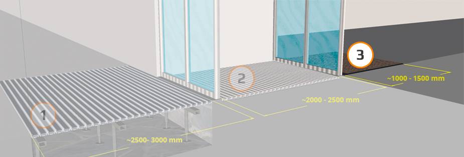Минимальная эффективная длина пути по всем трём функциональным зонам системы грязезащиты составляет шесть-семь шагов или приблизительно пять-шесть метров. По ширине зоны должны занимать всё пространство для потока пешеходов. Наиболее эффективные длины зон составляют: первая зона – 2,5-3,0 метра, вторая зона – 1,5-2,5 метра, третья зона – 1,0-2,0 метра.