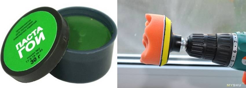 Мелкие царапинки можно попробовать заполировать пастой ГОИ. Для этого используем дрель с насадкой. Можно отполировать и вручную нанеся пасту на мягкую тряпку.
