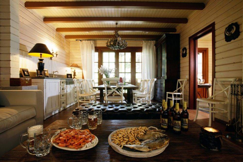 Если же взять за основу грубые балки и дополнить интерьер, например, шкурой или рогами — обстановка получится «охотничьей», в стиле шале.