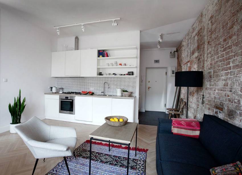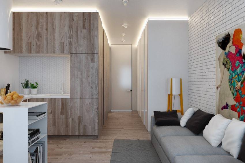 Небольшие помещения следует оформлять в светлых тонах. Исключением может стать использование темных оттенков на одной из акцентных стен. Такой дизайнерский секрет добавит дополнительной глубины помещению и приумножит свободное пространство, как видно на фото интерьера однокомнатной квартиры 20 кв.м.