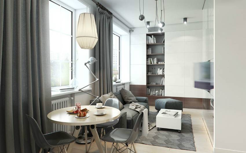 Мебели в современной квартире должно быть минимум. Она должна быть максимально функциональной, но не слишком громоздкой. С такой задачей идеально справиться современная мобильная мебель: шкафы-купе во всю стену для хранения, раскладные диваны с внутренними нишами, двухъярусные журнальные столики, мягкие пуфы с внутренним пространством. Наглядные примеры использование мобильной мебели можно увидеть на фото однокомнатной квартиры 34 кв. м., интерьер которой выполнен в стиле минимализм.
