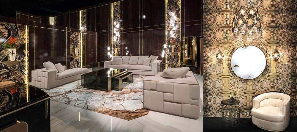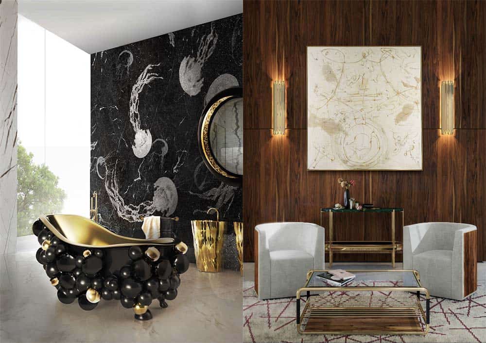 Применяйте их не на всех 4 стенах (если того не требует стиль), а для акцентирования модной золотистой мебели. Кстати, поговорим о мебели?..