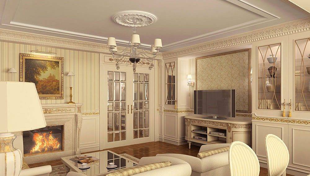 Интерьер гостиной в классическом стиле изысканный и богатый, однако без вычурности барокко или рококо