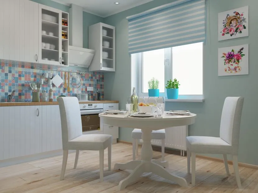 Маленькая кухня больше приемлет светлые варианты окраса обоев
