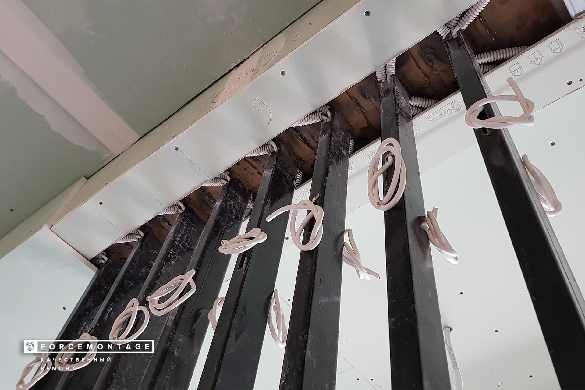 - Обшивка перегородки гипсокартоном, подключение подсветки, финишная и декоративная отделка.