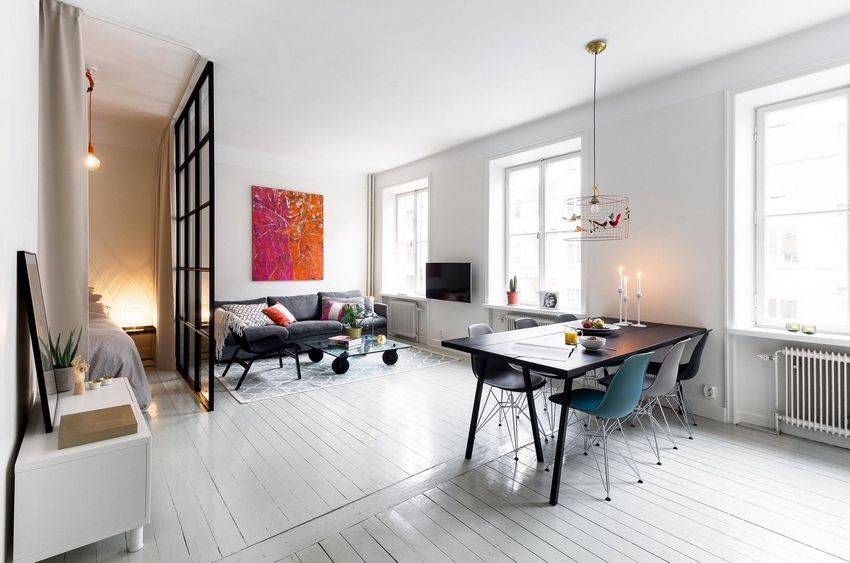 Раздвижные элементы разграничения представлены в огромном ассортименте: это конструкции в виде откатных и цельных элементов, ширм, занавесок. Они легко передвигаются, а при отсутствии потребности зонирования их можно просто сложить либо сдвинуть.