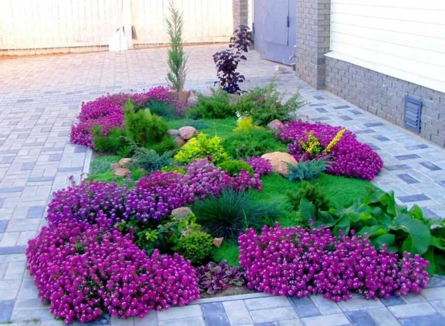 Цветники могут оформляться на небольших участках. Обычно площадь декоративных зон оставляет 5-8 квадратных метров. В таких композициях можно обходиться и без каменной подстилки. При оформлении стараются использовать такие виды растений:
