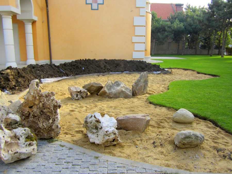 Как только дренажный слой будет выложен, его уплотняют слоем песка толщиной около 20 см. Основа из щебня и песка должна осесть и на это уходит 2 месяца. Вернувшись к устройству рокария через положенное время, начинают выкладывать его основу, которая должна состоять из крупных камней. Их устанавливают на уплотнившийся слой песка.